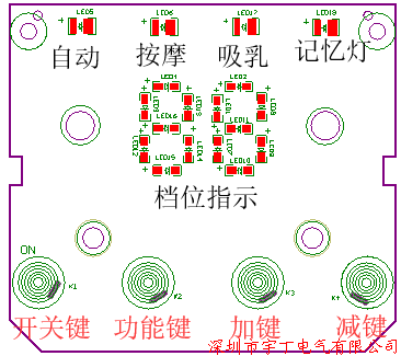 | 概述 | 本款仿生婴儿吸奶器控制板采用MCU控制技术,通过间歇性控制气泵和电池阀工作实现自动、按摩和吸乳的产品需求。同时,本款产品中档位范围为1-16档,增加了产品使用过程中吸奶力度的可调性。人机界面采用多个LED进行状态显示,同时,配备四个感应按键实现开关机工作、模式切换、档位调节的界面操作功能。 | |||||||||||||